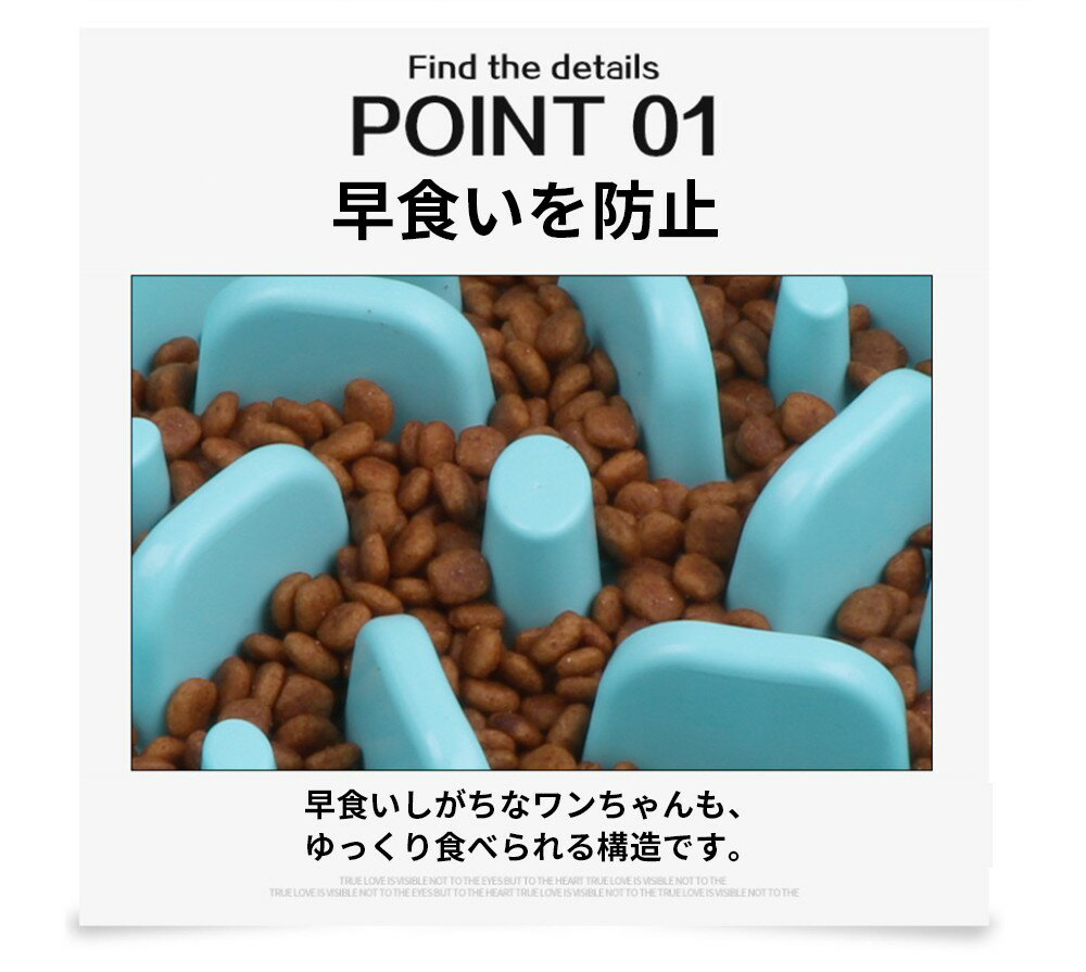 餌入れにドッグフードやキャットフードなどの餌を入れるだけで スローフードにみちびきペットの早食いを防止します。