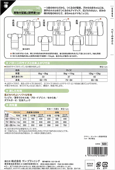 ベビーのゆかた パターン 赤ちゃんの浴衣が簡単につくれる型紙(パターン)です。