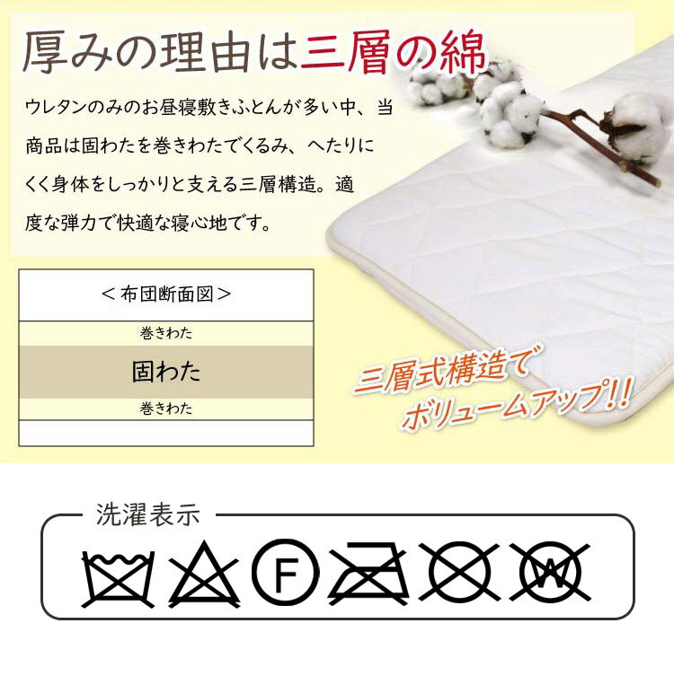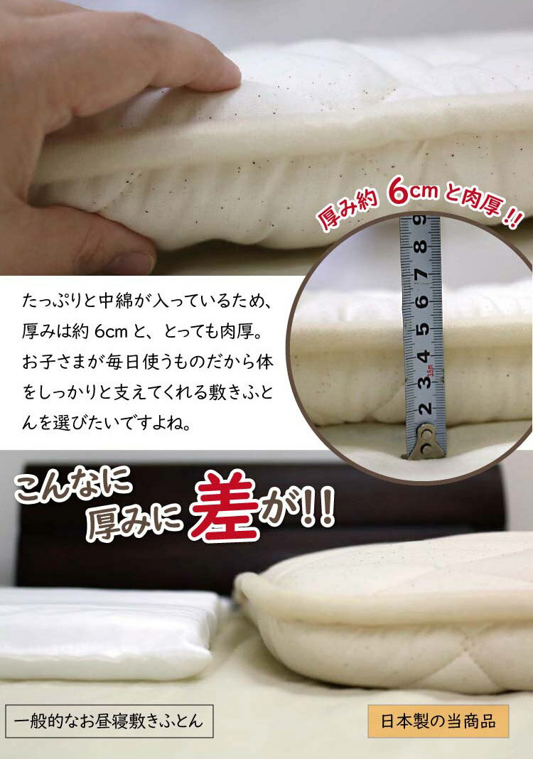・中綿をたっぷりと入れた三層式固綿敷きふとんなので、しっかりと身体を支え、健やかな成長のサポートをします。